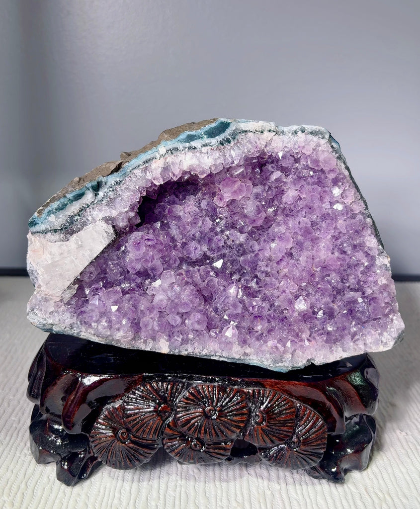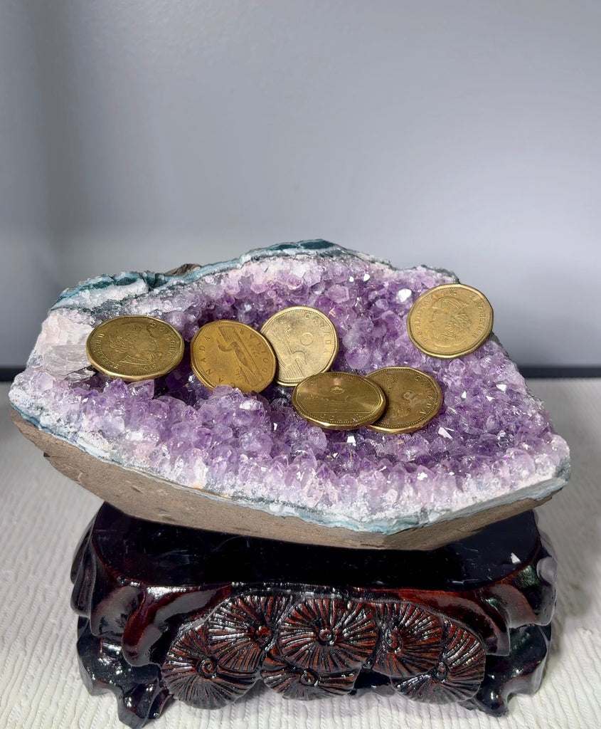 Placing six coins inside an amethyst cluster is a traditional Feng Shui wealth ritual. The number six symbolizes “smooth success” and continuous good fortune, while metal coins (the gold element) represent wealth energy. Amethyst is known for its ability to purify, attract positive energy, and act like a natural “wealth basin” that gathers and amplifies abundance.