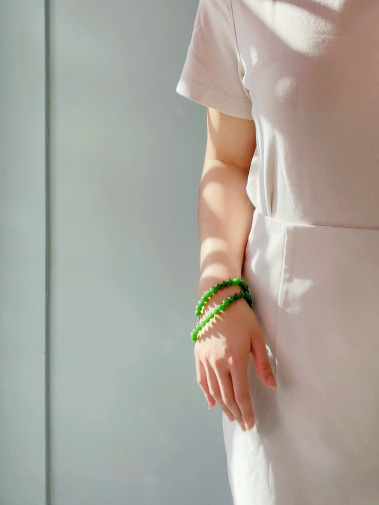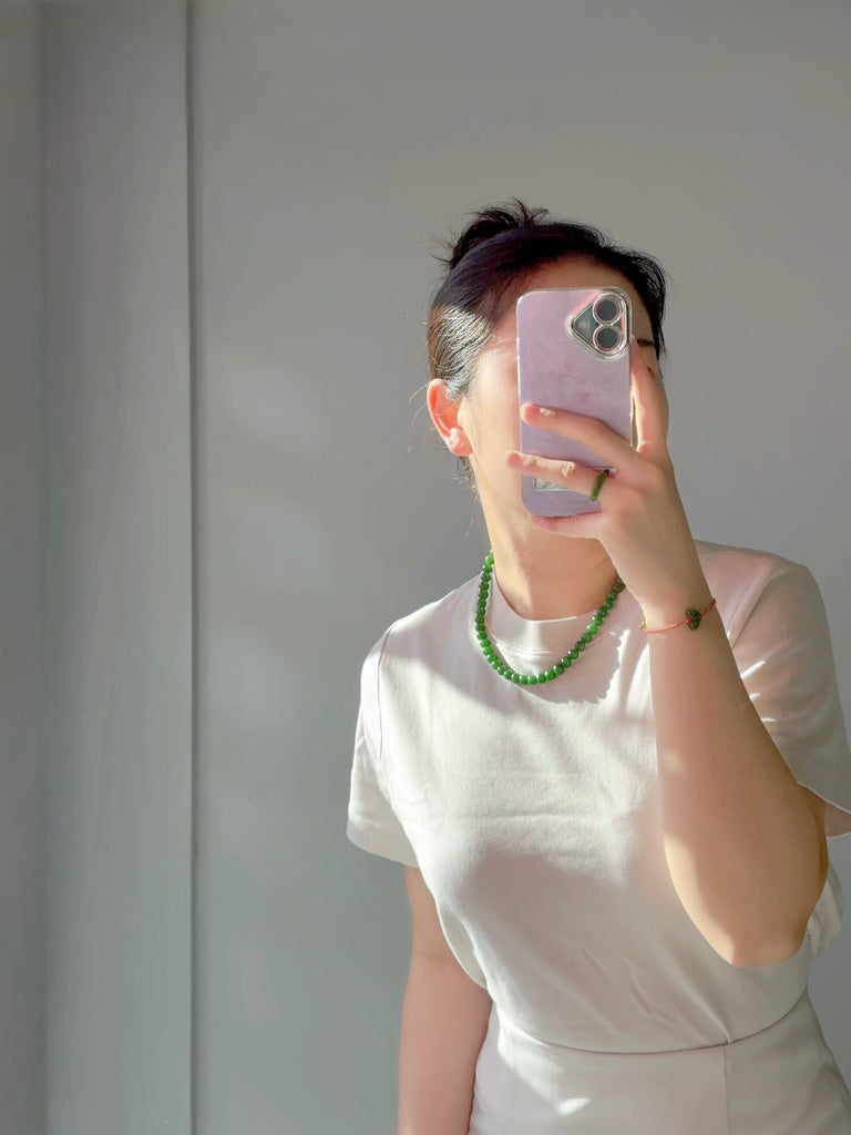 This Siberian nephrite jade necklace glows with a luminous green — a color that speaks of life, calm, and everlasting grace. Each bead reflects the gentle strength of jade: pure, steady, and enduring.