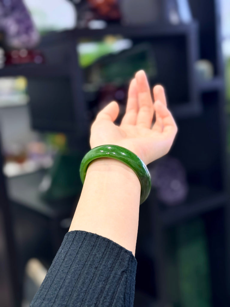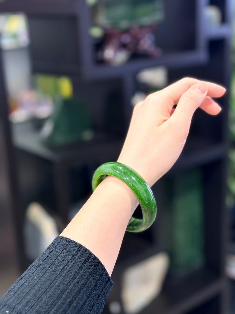 - Natural chromium inclusions ("green dots") shimmer like a galaxy within the jade, giving the bangle a subtle sparkle and unique character