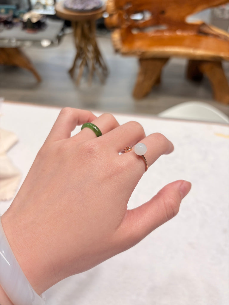 This ring features natural Hetian white jade—symbolizing purity, harmony, and gentle protection—set on a refined rose-gold band. A gold heart dances beside the jade bead, creating a piece that feels romantic, soft, and full of meaning.