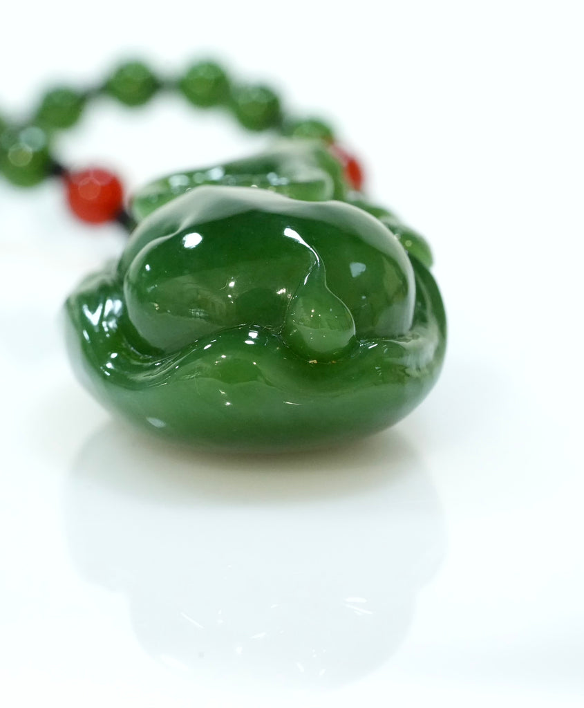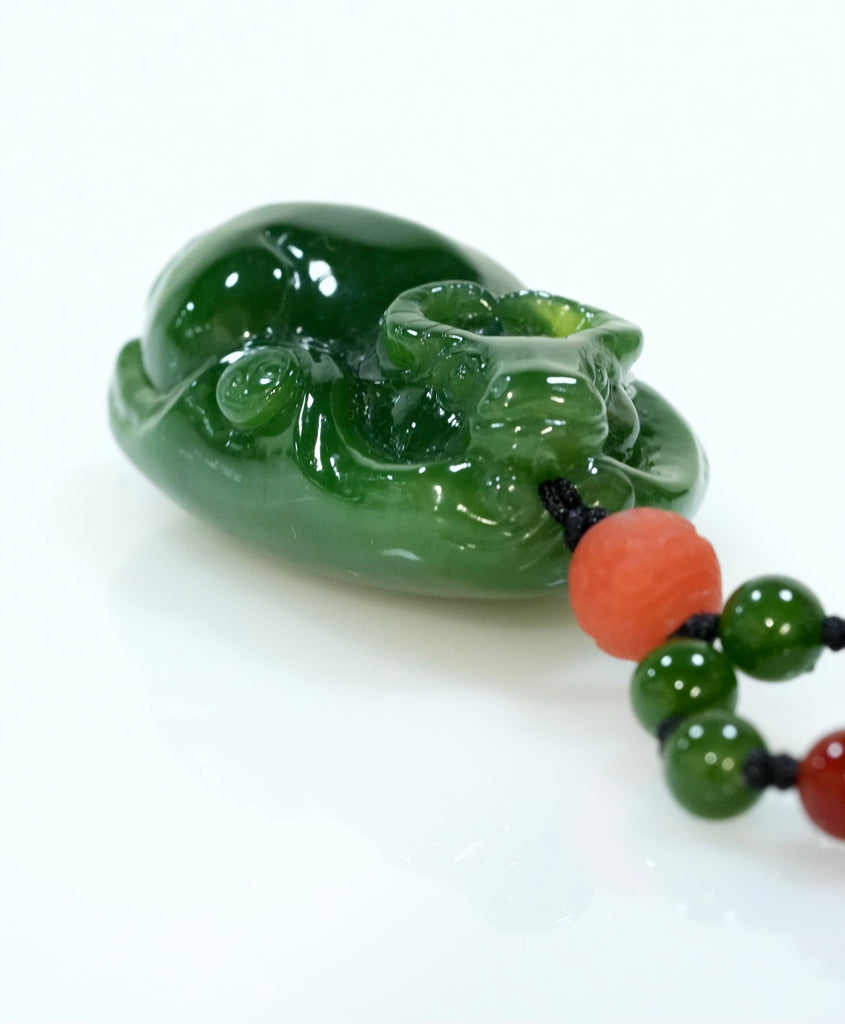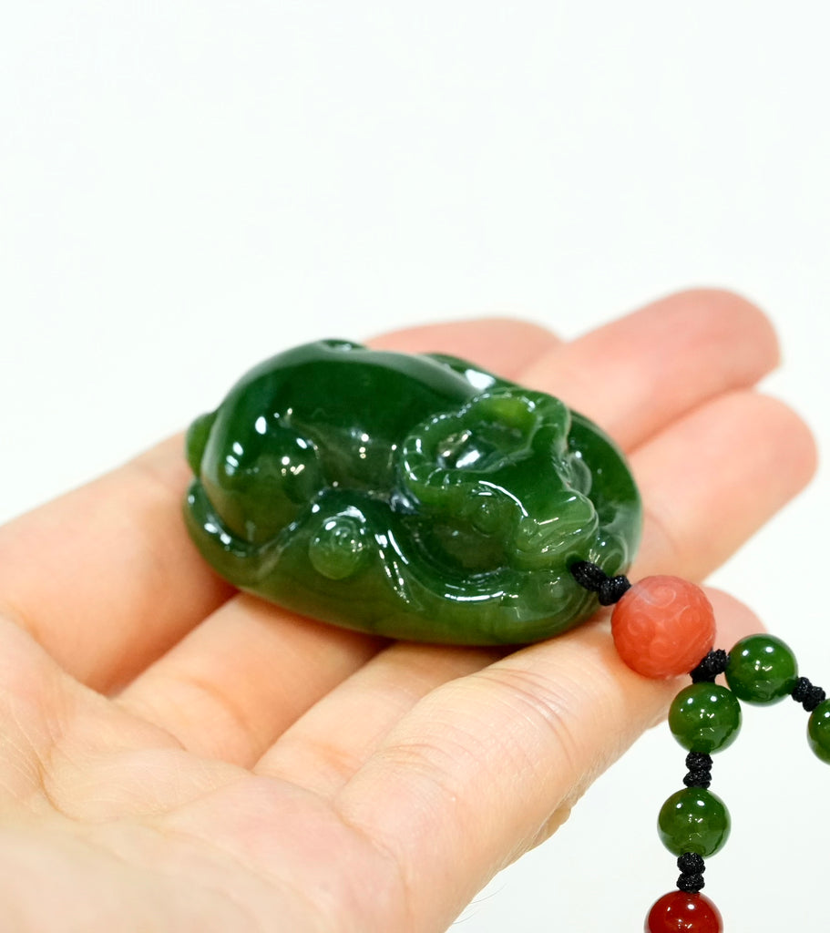 This jade carving features a peaceful water buffalo resting on a lotus leaf—symbol of harmony and calm. The buffalo’s horns gently form a heart shape, representing love, fulfillment, and heartfelt wishes.