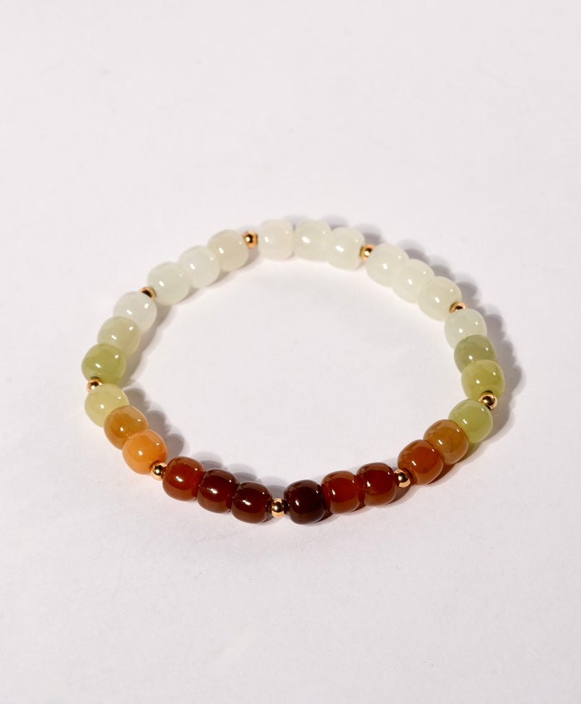 This bracelet is a unique combination of four different Jade colours. It can be worn alone or paired with other jewellery, making it extremely versatile. Hetian jade helps keep its wearer from harm and negative energies. It also promotes serenity and joy during tough times.