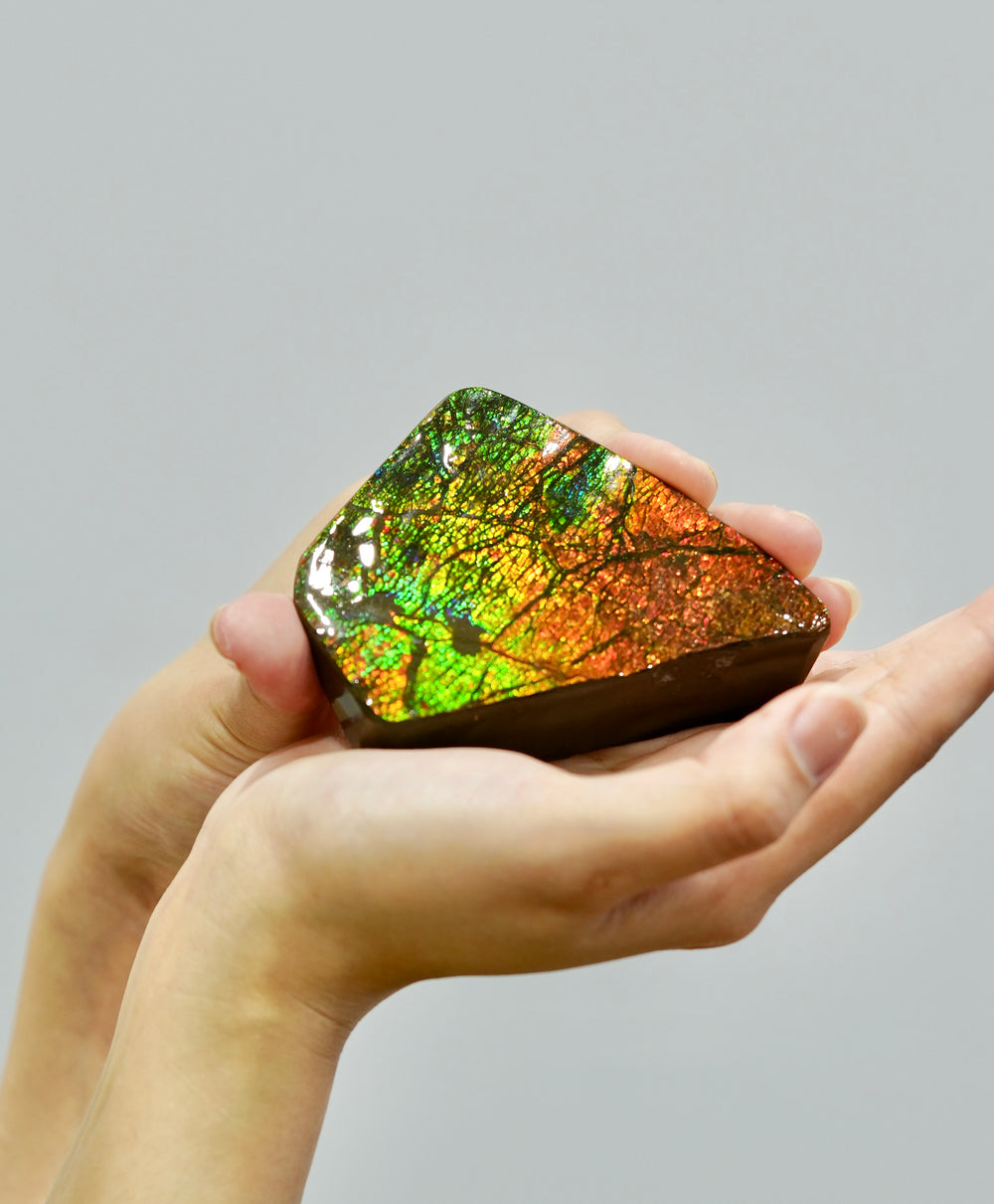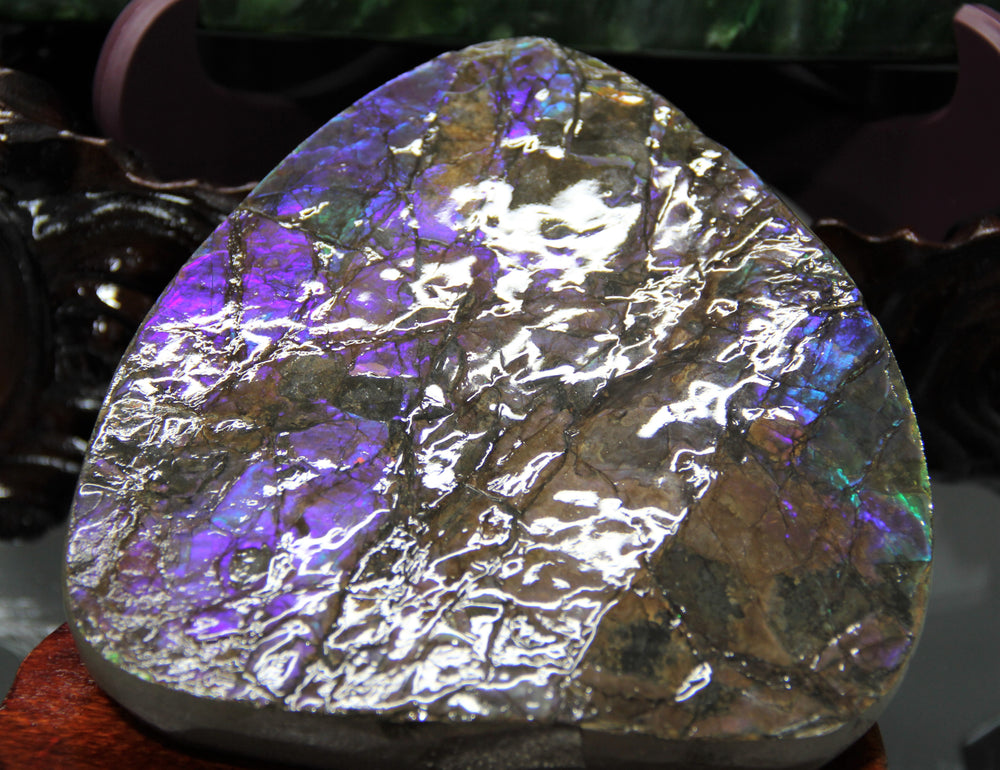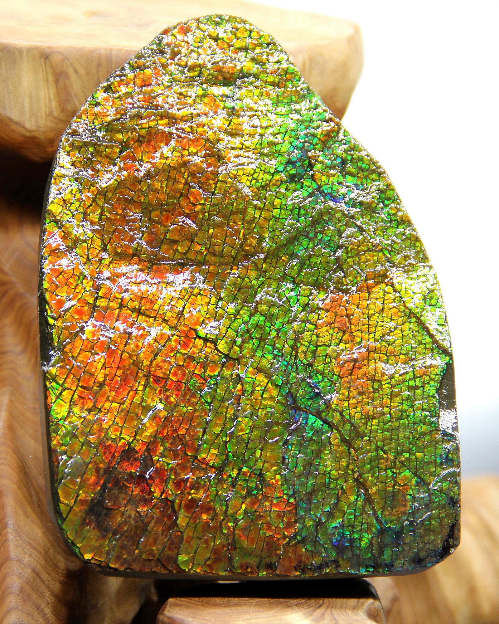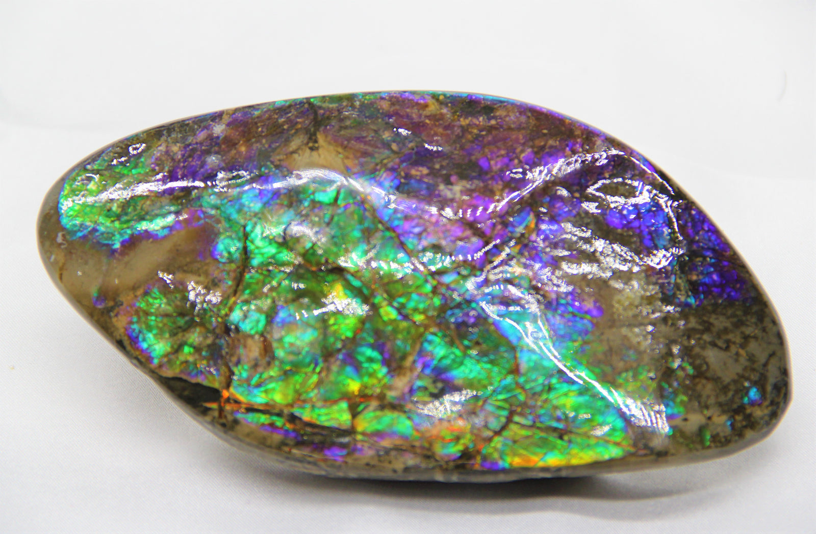 只有加拿大阿尔伯塔省的史前熊掌海底构造地区发现的斑彩螺化石才可以被定义为宝石级的斑彩石。(from GIA)
