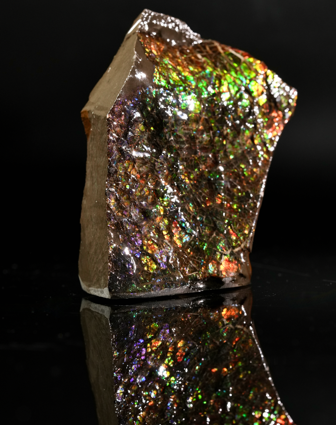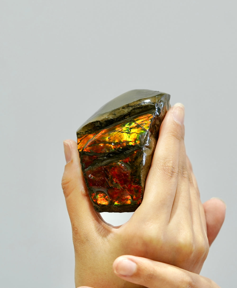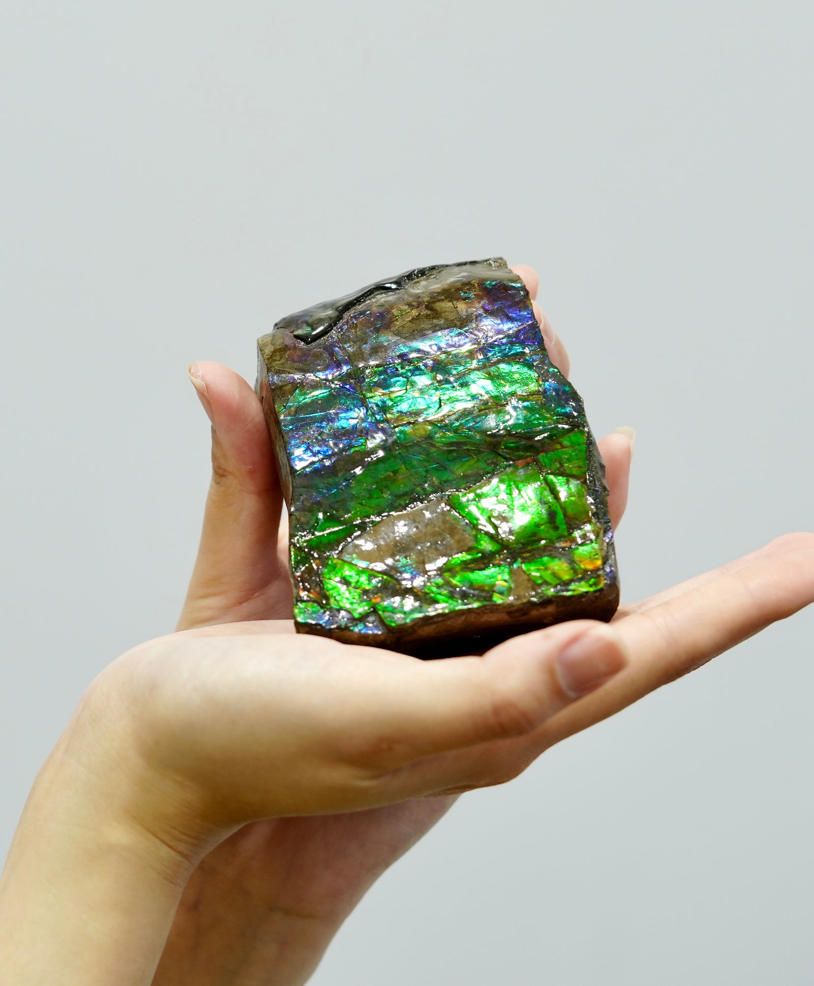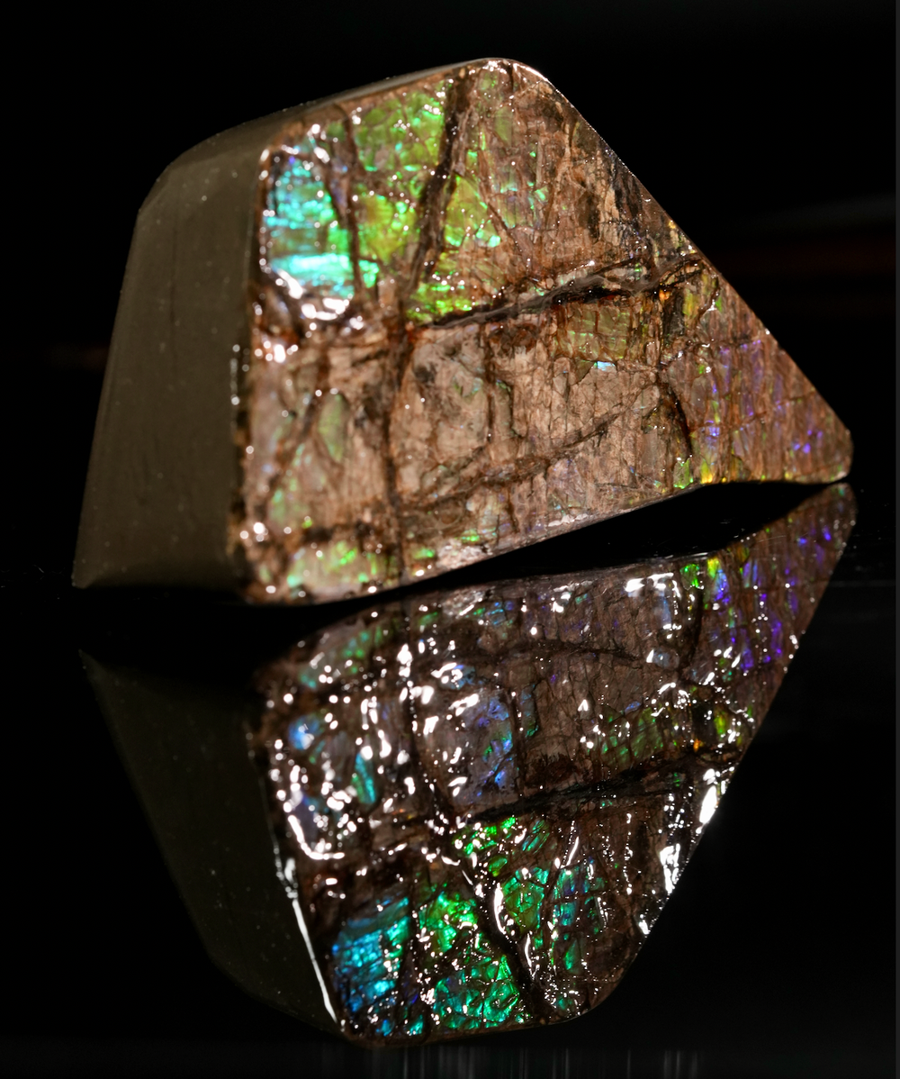只有加拿大阿尔伯塔省的史前熊掌海底构造地区发现的斑彩螺化石才可以被定义为宝石级的斑彩石。(from GIA)