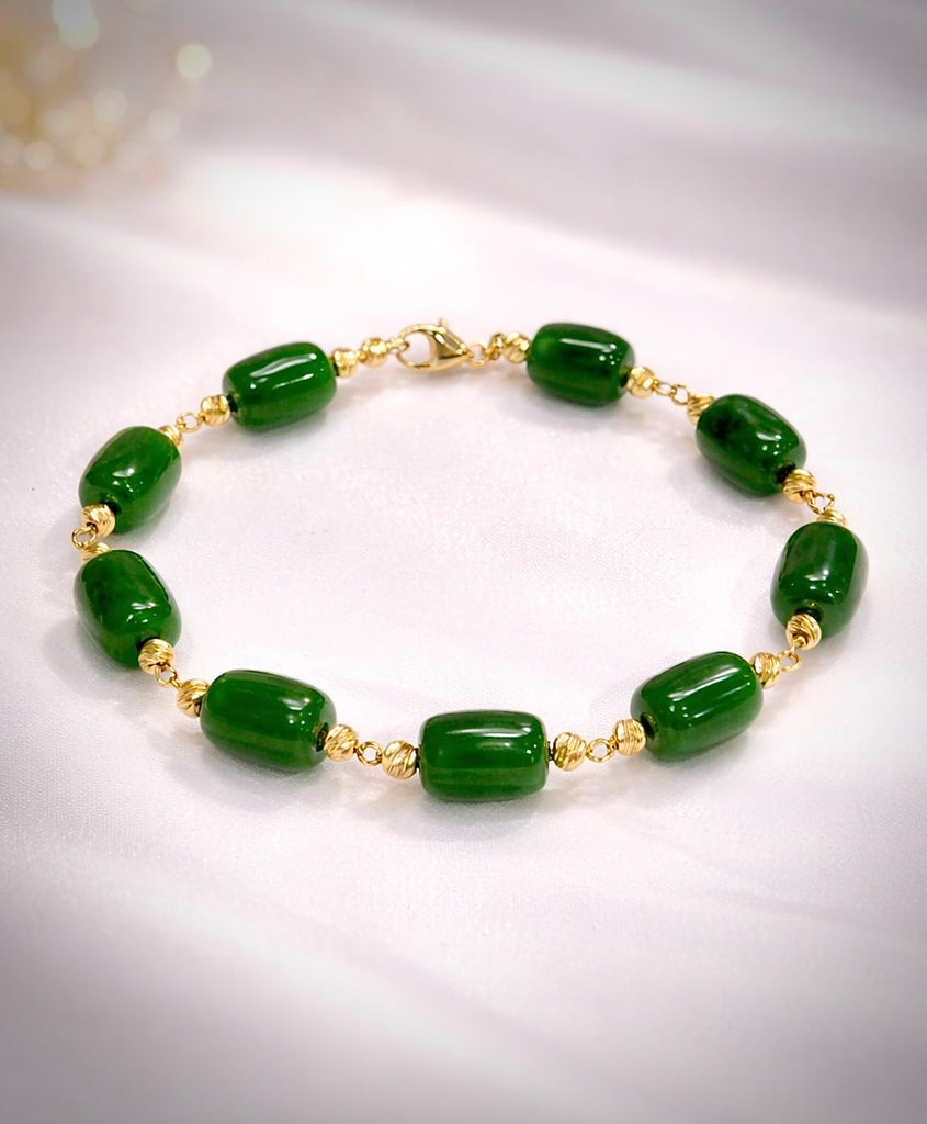 星空手链:捕捉散落星星的美丽和优雅。这款手链中的鼓珠形状独特,为手链营造出流畅的整体外观。鲜艳的绿色在灯光下也非常绚丽。佩戴玉石有助于为您的生活带来财富和成功,并帮助您平衡情绪。